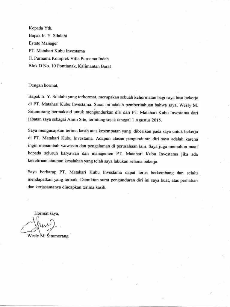 Surat pengunduran diri adalah pernyataan tertulis dalam bentuk surat yang berisikan pemberitahuan bahwa kamu ingin berhenti dari pekerjaan. Berikut adalah contoh surat pengunduran diri (resign) yang baik dan benar dilengkapi dengan format susunan serta file doc yang bisa diedit. Jakarta, 29 september 2016 kepada yth: Berikut daftar contoh surat pengunduran diri atau contoh surat resign yang baik dan benar yang bisa dijadikan pedoman. Dinamikanya bisa bikin kamu capek dan menyerah sehingga .